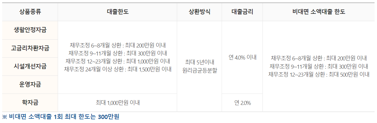 채무조정 성실상환자를 대상으로 생활안정자금, 학자금, 운영자금 등 긴급자금을 직접 지원하는 제도로 아래 조건에 해당하시는 분들이 대상이 될수 있습니다.
