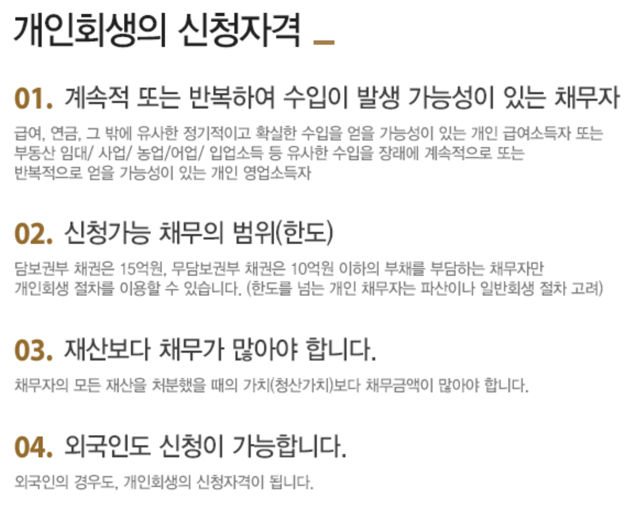 신청 요건으로는 지속적이고 반복적인 수입이 있어야 하며, 무담보 채무가 15억 원 이하, 담보 채무가 10억 원 이하일 경우에 해당됩니다.