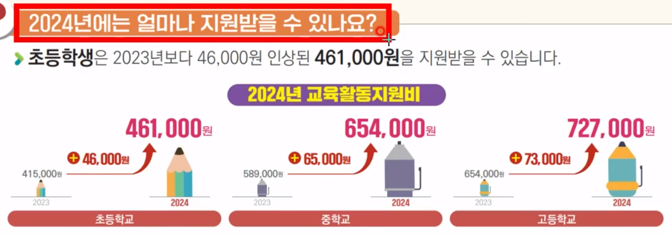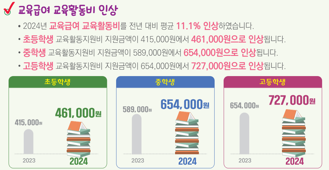 2024년에는 초등학생의 경우 작년 41만 5,000원에서 46,000원 인상된 46만 1000원, 중학생의 경우 작년 58만 9,000원 받던 것을 65,000원 인상되어 65만 4,000원, 고등학생 의 경우 작년 65만 4,000원 받던 것을 73,000원 인상되어 72만 7,000원을 지원받게 됩니다