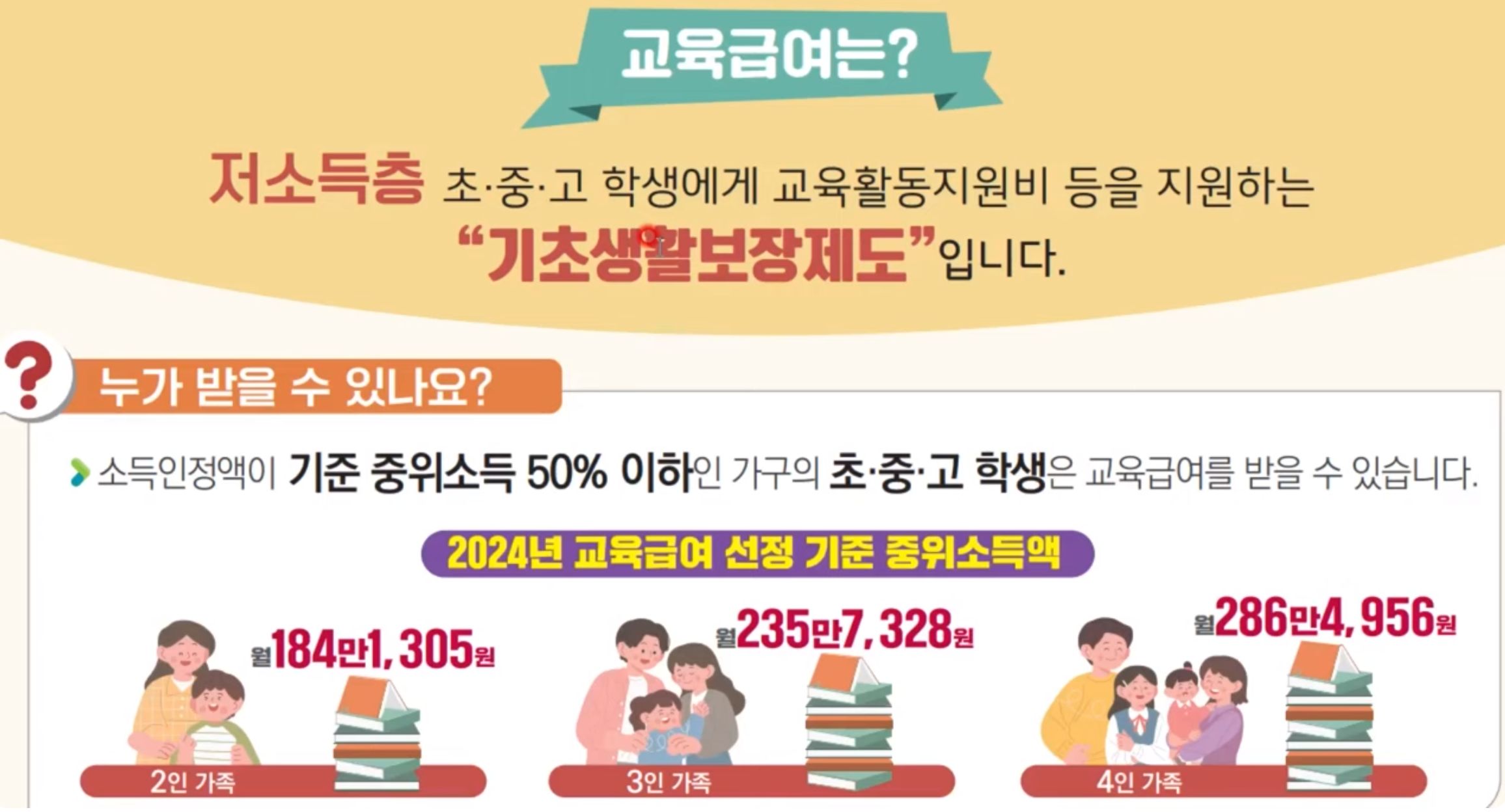 따라서 교육급여 산정 방식으로 소득인정액 중위소득 50%를 초과하여 교육급여를 지원받지 못하더라도, 소득재산 기준에 따라 교육비 지원은 받을 수도 있습니다.