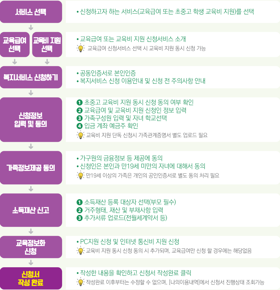 거주지 읍·면·동 주민센터에 방문신청하거나 온라인(PC 또는 모바일)으로 언제, 어디서나 신청 가능하며, 교육급여와 교육비 동시신청 가능하니 참고하시기 바랍니다.