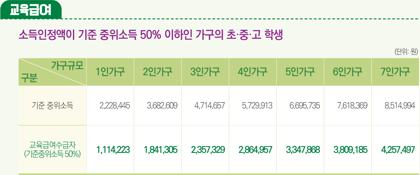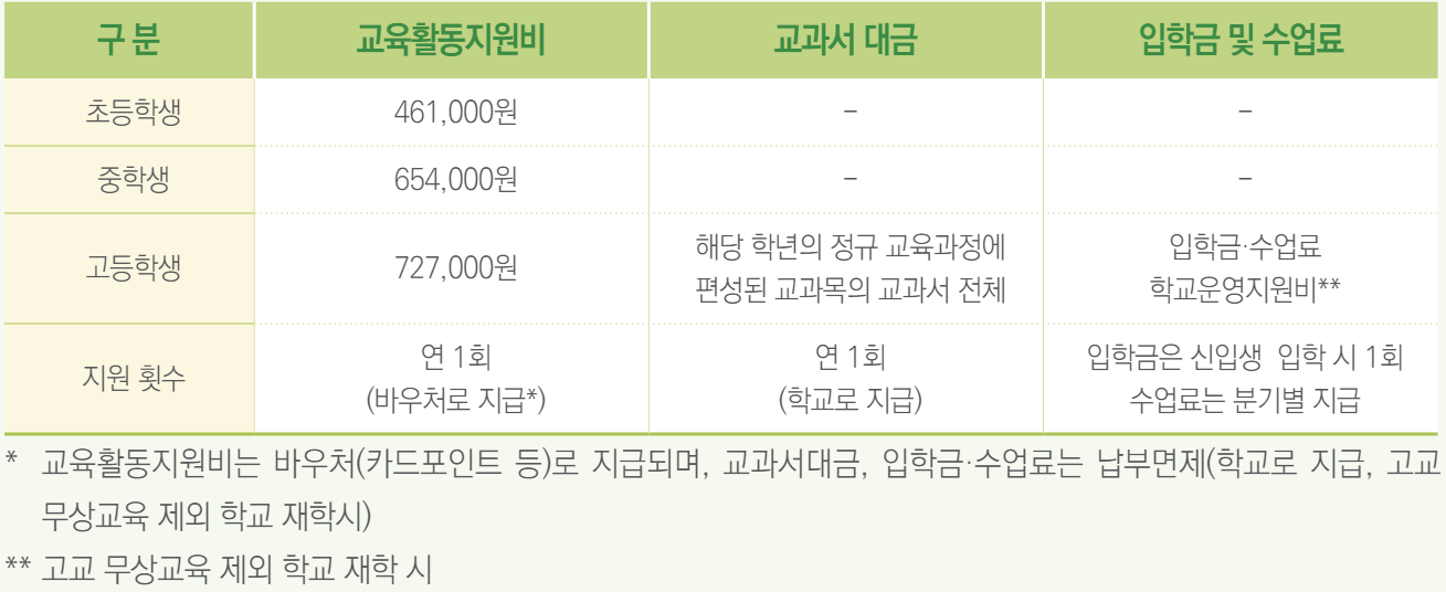 '국민기초생활 보장법'에 따른 기초생활보장제도의 하나로 기준 중위소득 50% 이하인 가구의 초중고 학생에게 교육활동지원비를 지급하는 제도로, 올해 교육활동지원비는 작년에 비해 11% 인상되어 연간 초등학생 461,000원, 중학생 654,000원, 고등학생 727,000원을 지원합니다.