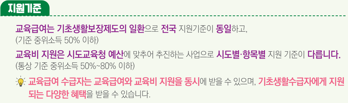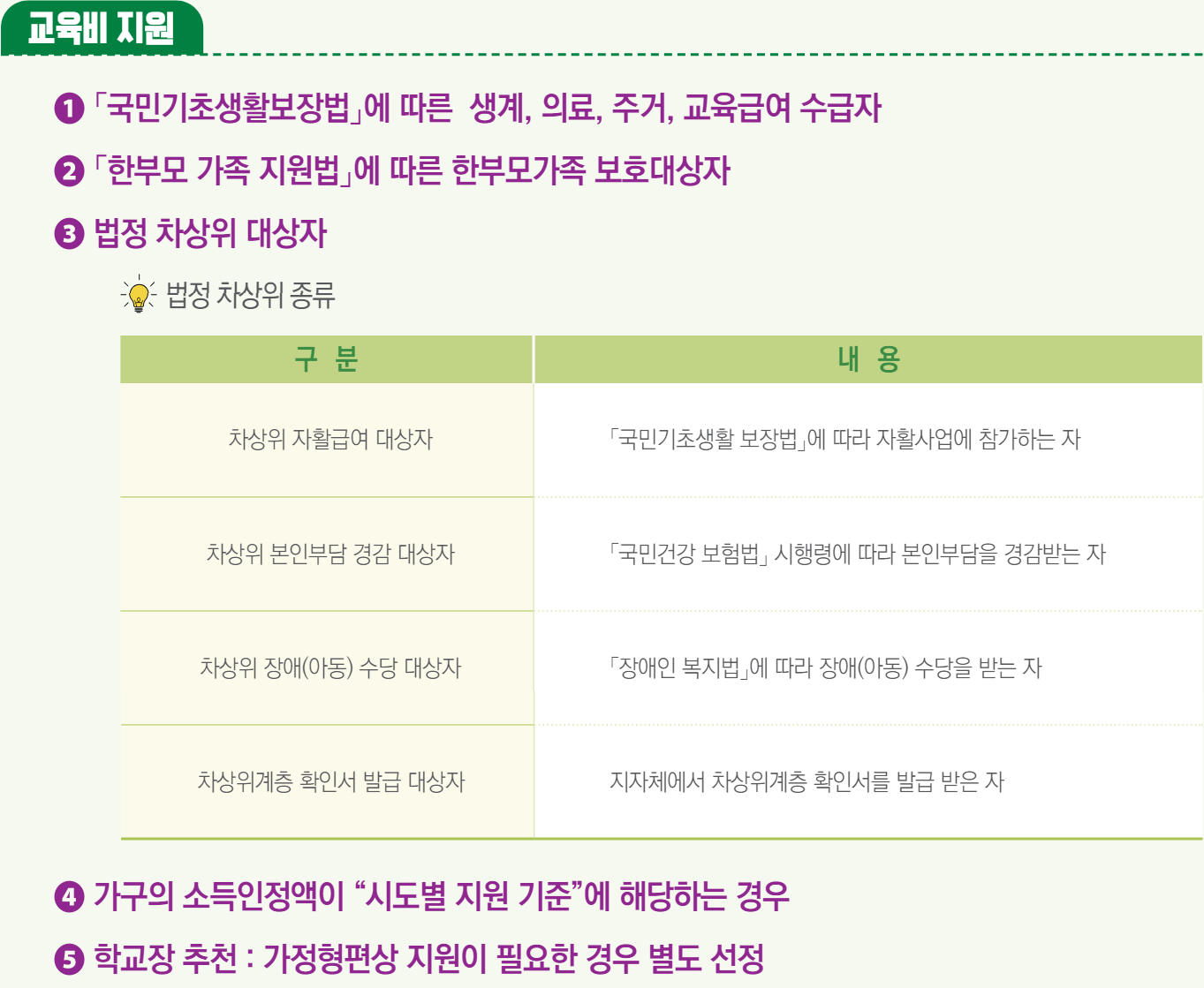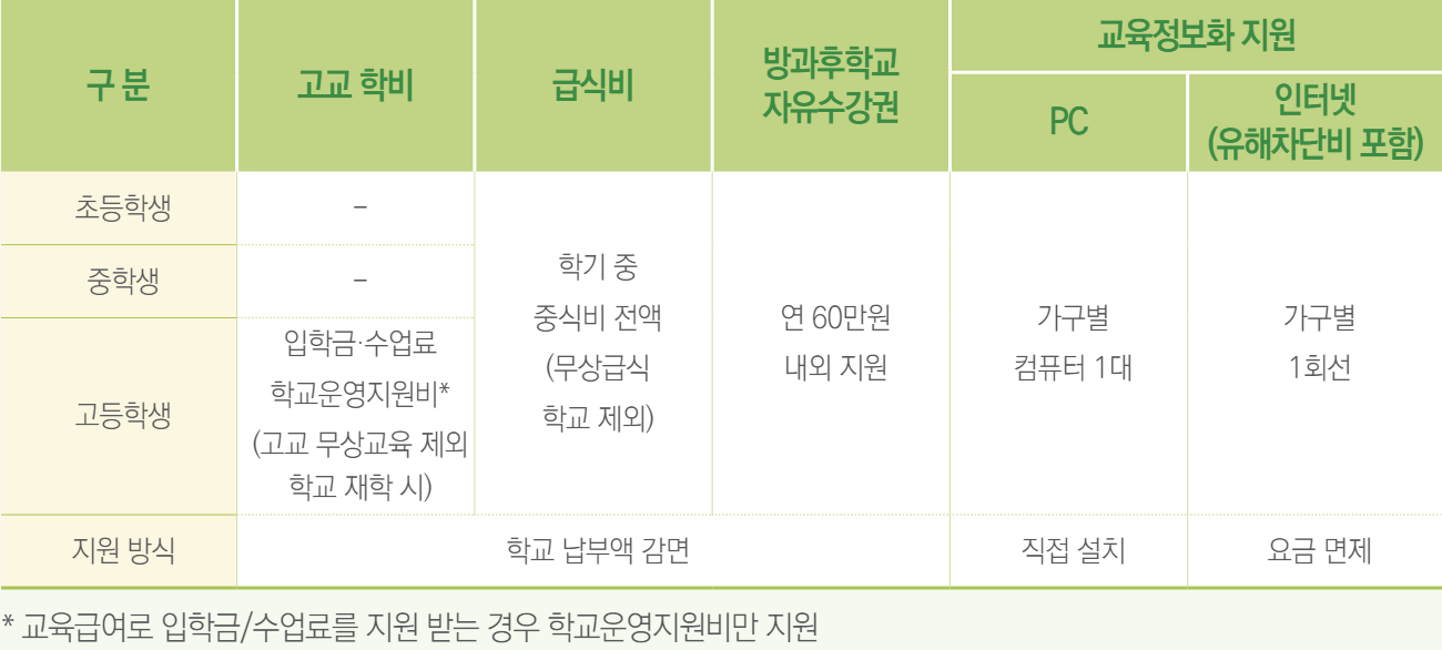 '초‧중등교육법'에 근거하여 시‧도교육청별로 자체 지원 기준에 따라 입학금·수업료, 학교급식비, 학교운영지원비, 교과서비, 방과후학교 자유수강권, 교육정보화(컴퓨터, 인터넷 통신비) 등을 지원하는 사업으로, 시‧도교육청 재량 사업이기 때문에 시‧도교육청별로 선정기준이 모두 다를수 있습니다.