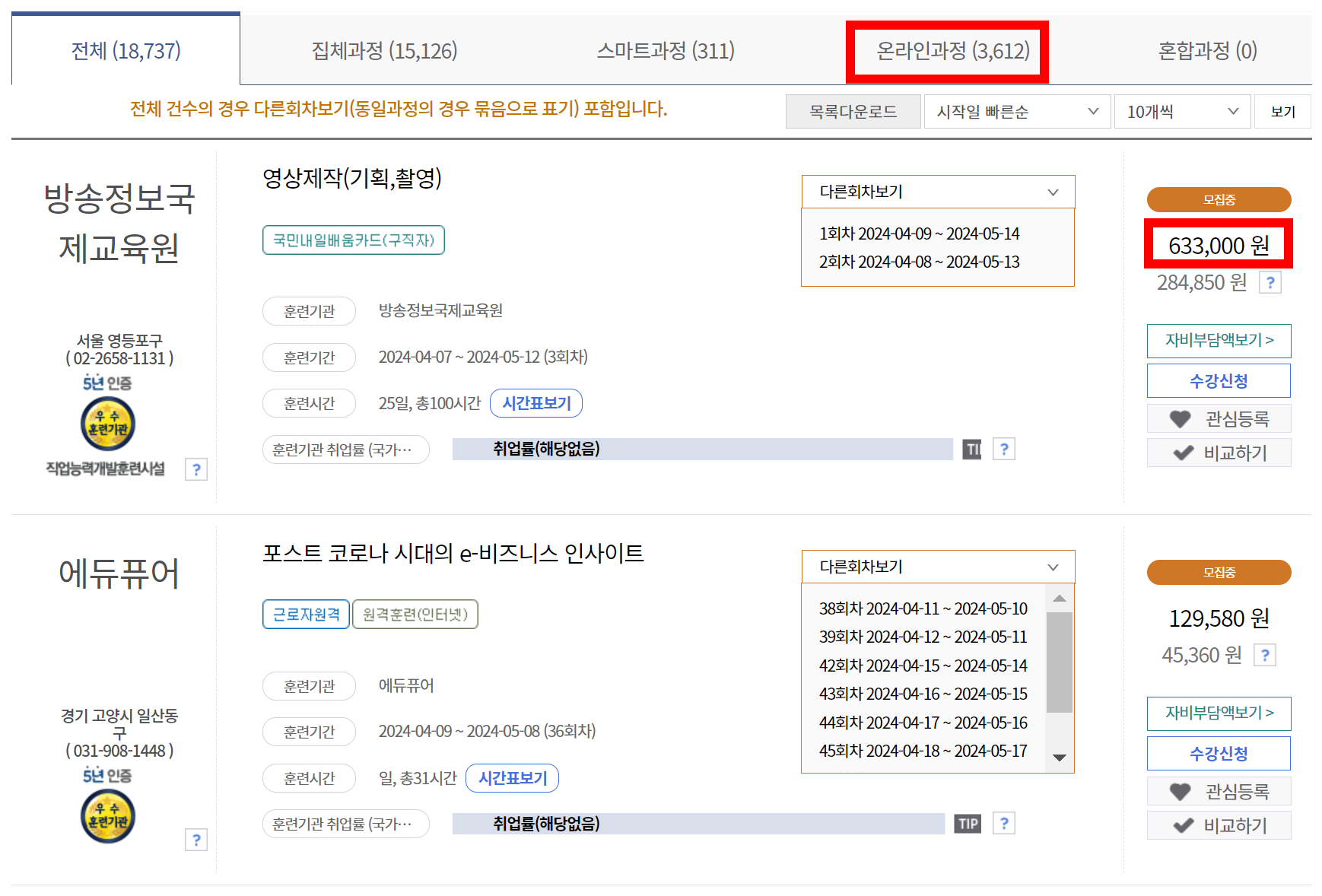 이렇게 많이 나오는데요. 여기에서 위쪽의 큰 금액이 해당 수업의 총 가격이고, 그 아래에 있는 작은 금액이 수강생이 지불해야 되는 자기부담금 입니다.
