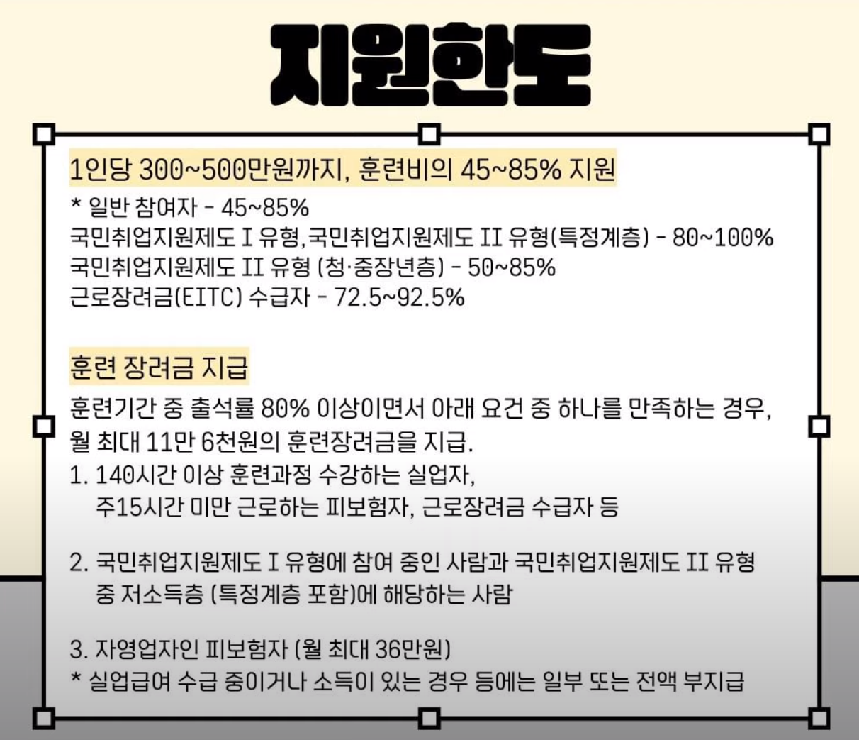 아울러 질병, 사고, 훈련기관 사정, 천재지변 등 불가피한 사정없이 중도에 훈련 수강을 그만둔 경우 횟수에 따라 훈련비 외에 20만원(1회)·50만원(2회)·100만원(3회)만큼 한도가 차감된다고 하니 주의하셔야 겠습니다.