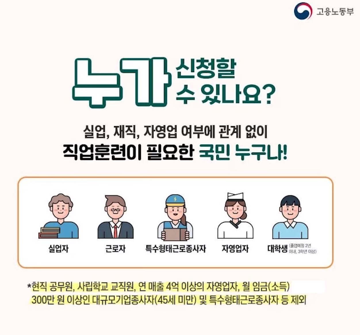 · 구직 신청이 필용한 훈련 : 국가기간/전략산업직종훈련, K-디지털 트레이닝, 일반고 특화훈련