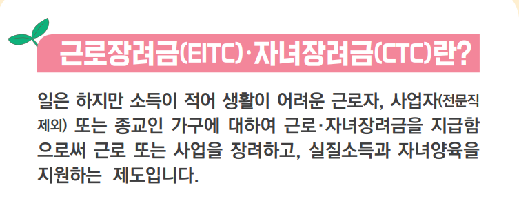 일은 하지만 소득이 적어 생활이 어려운 근로자, 사업자(전문직 제외) 또는 종교인 가구에 대하여 가구원 구성과 근로소득, 사업소득 또는 종교인 소득에 따라 산정된 근로장려금을 지급함으로써 근로를 장려하고 실질소득을 지원하는 제도입니다.