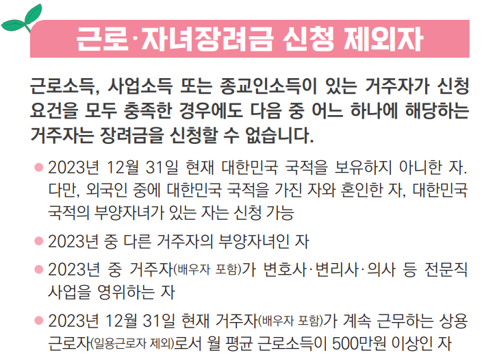 - 2023.12.31일 현재 거주자(배우자 포함)가 계속 근무하는 상용근로자로서 월평균 총 급여액 500만 원 이상인자(근로장려금만)