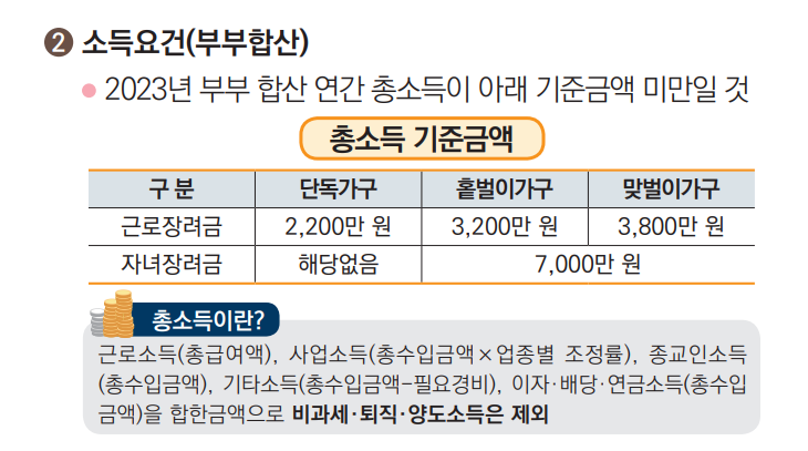 | 소득 기준(부부합산) | 근로, 사업, 종교인, 기타, 이자, 배당, 연금소득의 합계금액 | 근로, 사업, 종교인 소득의 합계금액 |