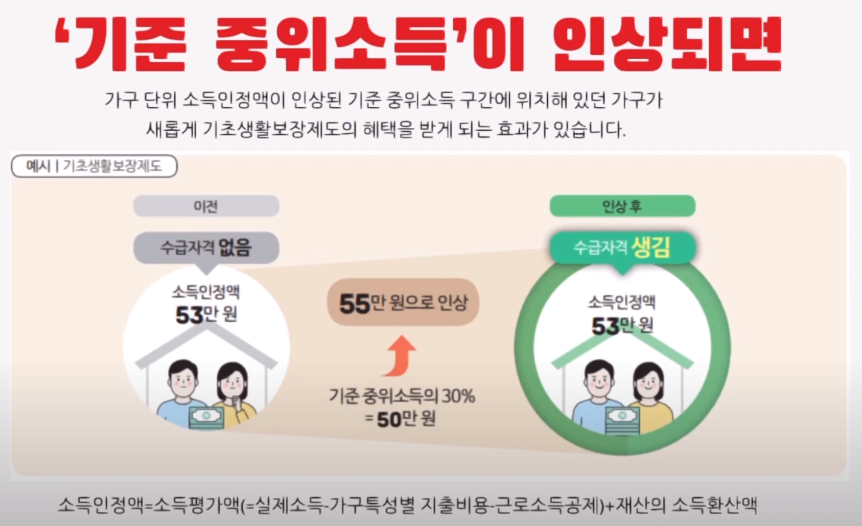 따라서 기준중위소득이 인상되면 가구단위 소득인정액이 인상된 기준중위소득 구간에 위치해 있던 가구가 새롭게 기초생활 보장제도에 혜택을 받게 되는 효과가 있습니다.