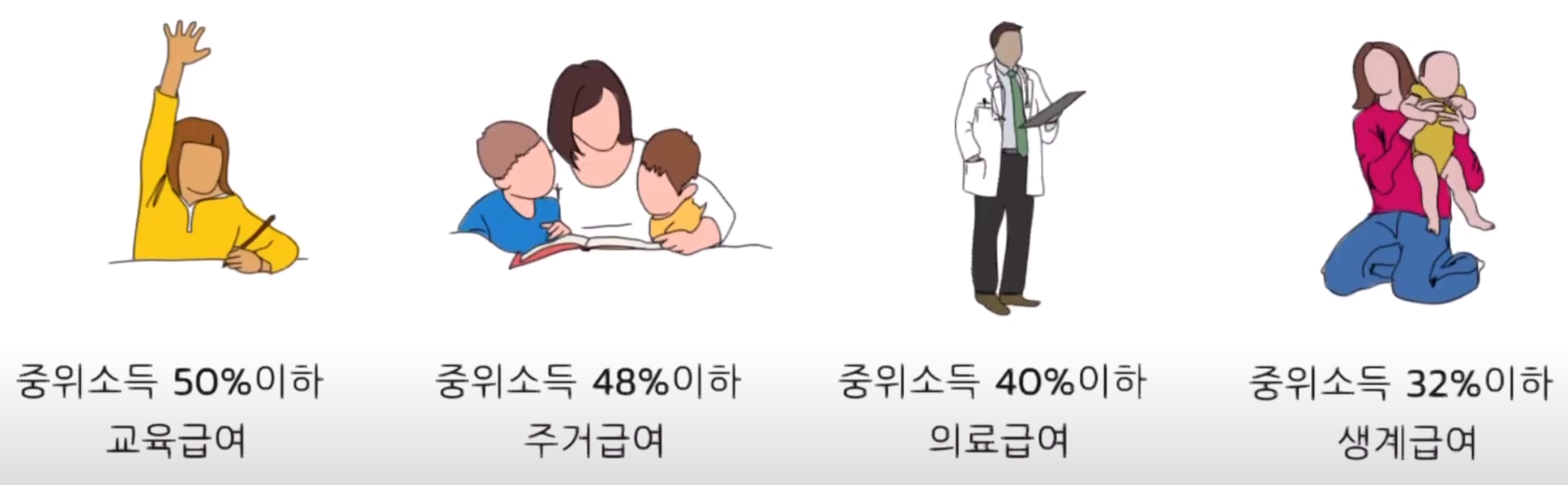 평균소득에서 딱 절반을 자른 중위소득 50% 이하에 해당되시면 교육 급여를 받을 수 있으며, 48% 이하는 주거급여, 40% 이하는 의료급여, 32% 이하는 생계급여를 받을 수 있습니다.