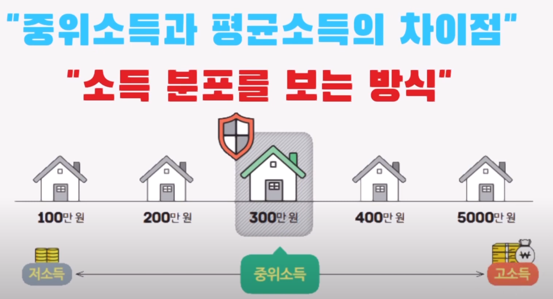 위에 예시에서 다섯 가구의 연소득을 모두 합하면 2천만 원입니다. 가구수는 총 다섯 가구이기 평균 소득은 2천만 원을 오로 나눈 값인 400만 원입니다. 중위소득과 평균소득의 차이점은 소득 분포를 보는 방식입니다.