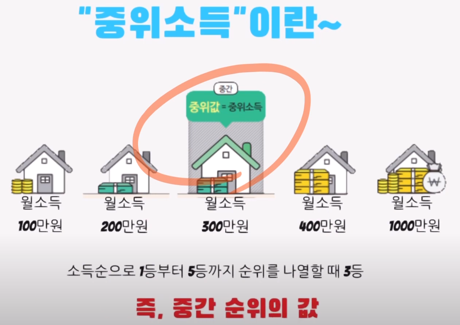 중위소득이란 국민가구 소득을 순서대로 나열할 때 중간에 위치한 소득입니다. 예를 들어 국내 가구 수가 총 다섯 가구이고 각 가구의 월 소득은 100만 원, 200만 원, 300만 원, 400만 원, 1천만 원이라고 가정하면 중간에 위치한 300만 원이 중위 소득이 됩니다.