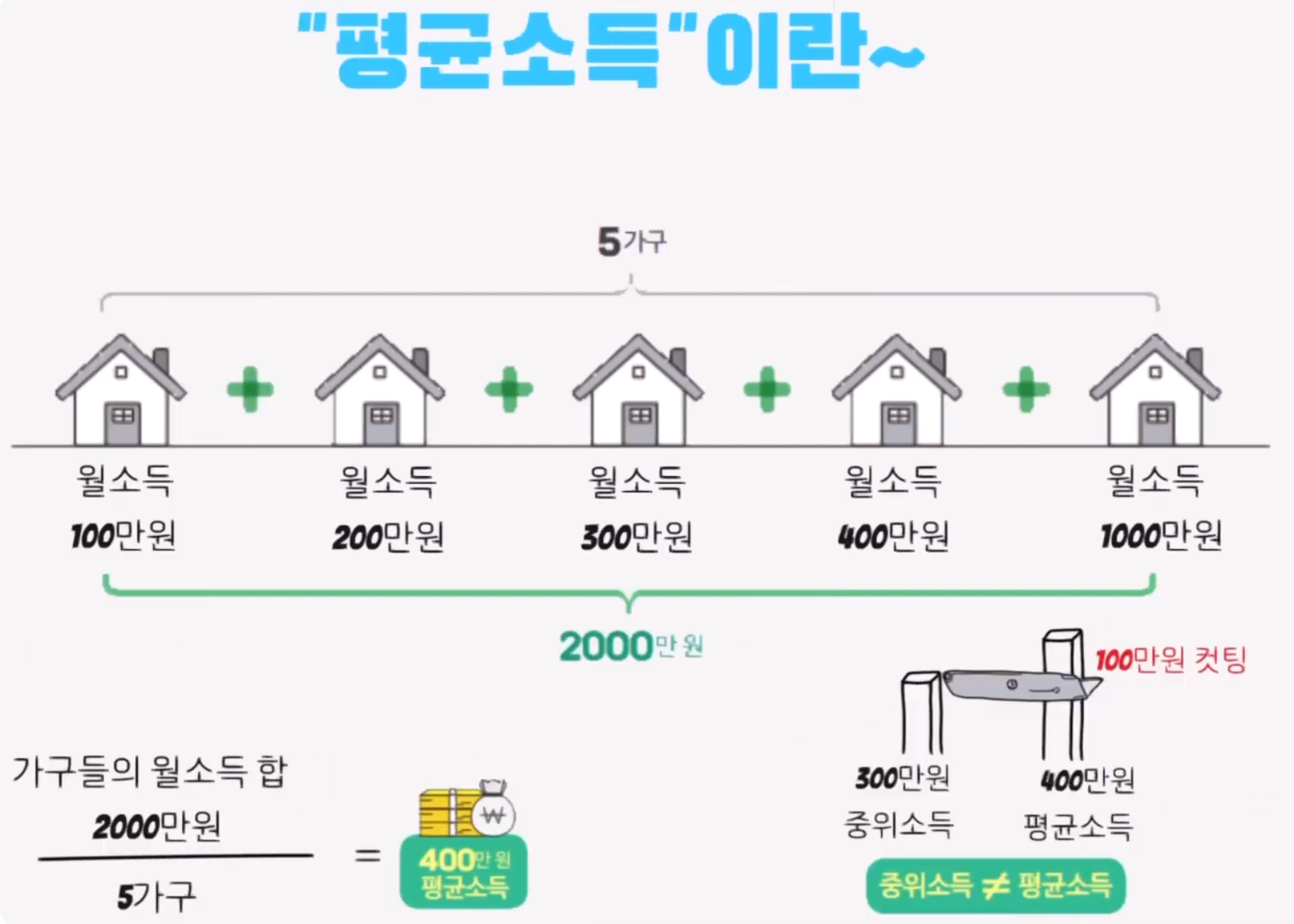평균소득이란 모든 가구에 소득을 합한 후 가구 수로 나눈 값입니다.