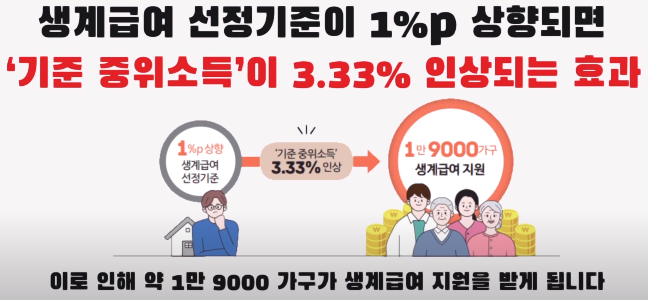 생계급여 선정 기준이 1% 포인트 상향되면 기준중위소득이 3.33% 인상되는 효과가 있습니다. 이로 인해 약 1만 9천 가구가 생계급여 지원을 받게 됩니다.