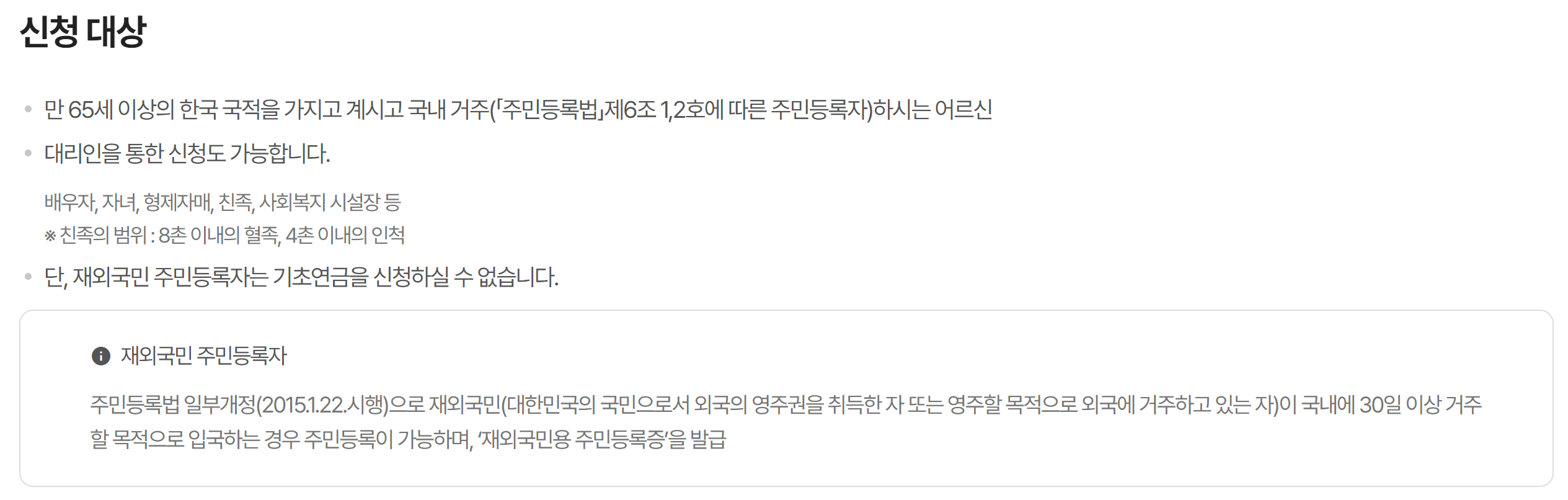 대리인 신청시에는 기초연금 관련 위임장, 그리고 수급 희망자와 대리인의 신분증을 함께 제시하여야 합니다. 수급 희망자가 의식 불명자(치매, 뇌사 등) 신분증 재발급이 어려운 경우에는 진단서로 신분증 대체가 가능합니다.