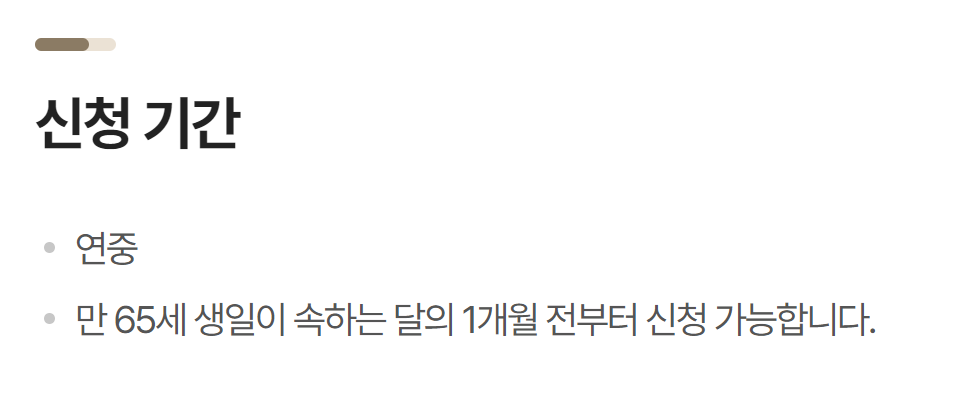 신청기간은 만 65세 생일이 속한 달의 전달 1일부터 가능하고, 실제 지급은 본인의 생일달부터 지급을 시작합니다. 그리고 아무리 늦어도 만 65세 생일이 속한 달까지는 반드시 신청을 하시는게 좋습니다.