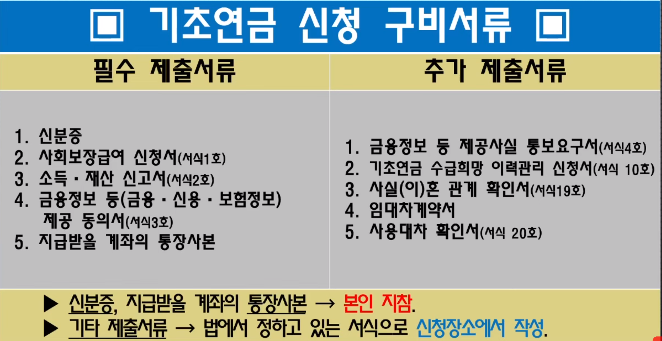 기초연금 신청 구비서류는 필수 제출서류 다섯 가지, 추가 제출서류 다섯 가지로 구분이 됩니다. 내용이 복잡하긴 하지만 미리 확인해 두실 필요가 있습니다.