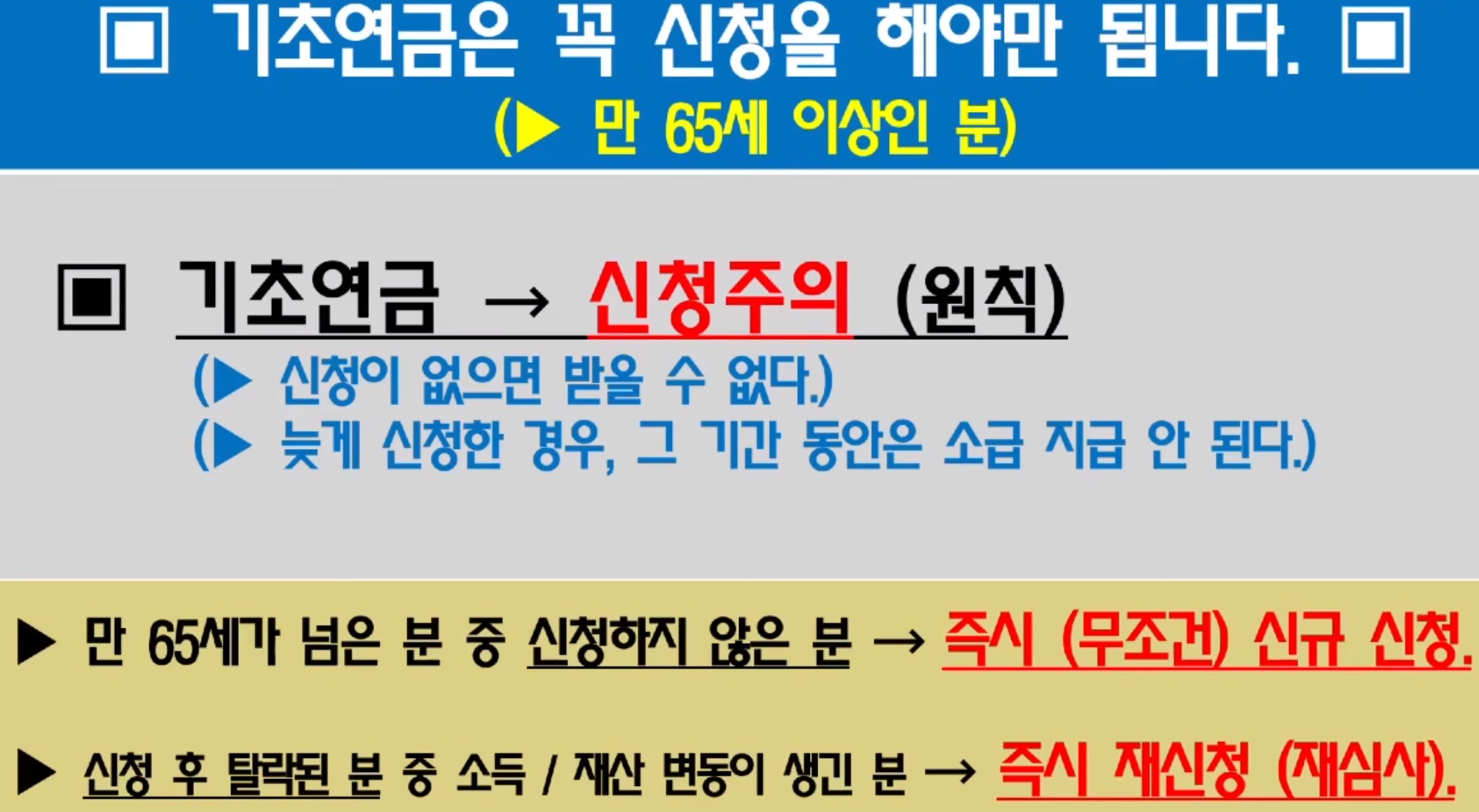 그래서 만 65세가 넘은 분 중에 신청하지 않은 분들은 즉시 무조건 신규 신청하시고, 신청 후에 탈락된 분들 중에 소득이나 재산 변동이 생긴 분들은 즉시 재신청해서 재심사 받으시길 바랍니다.