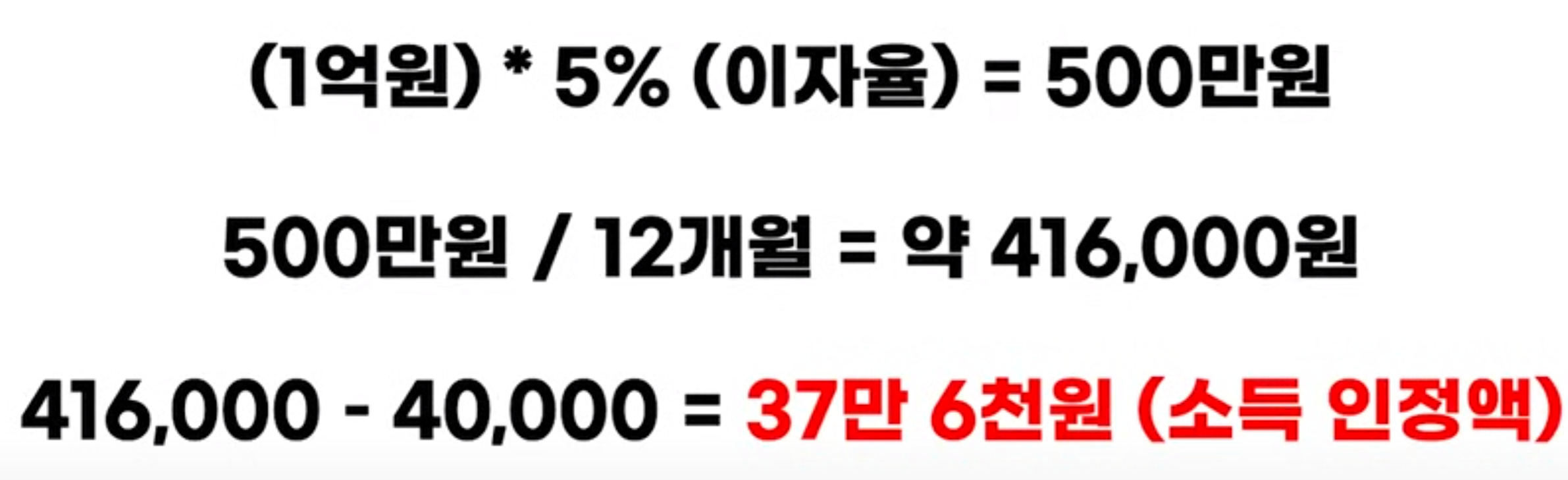 그럼 이번엔 이자 소득도 계산해 볼게요. 이자 소득은 세금 공제전 소득을 기준으로 적용됩니다. 그리고 기본공제는 월 4만 원 입니다. 따라서 정기예금 1억원에 대한 연 5% 이자소득은 월 37만 6천원이 됩니다.