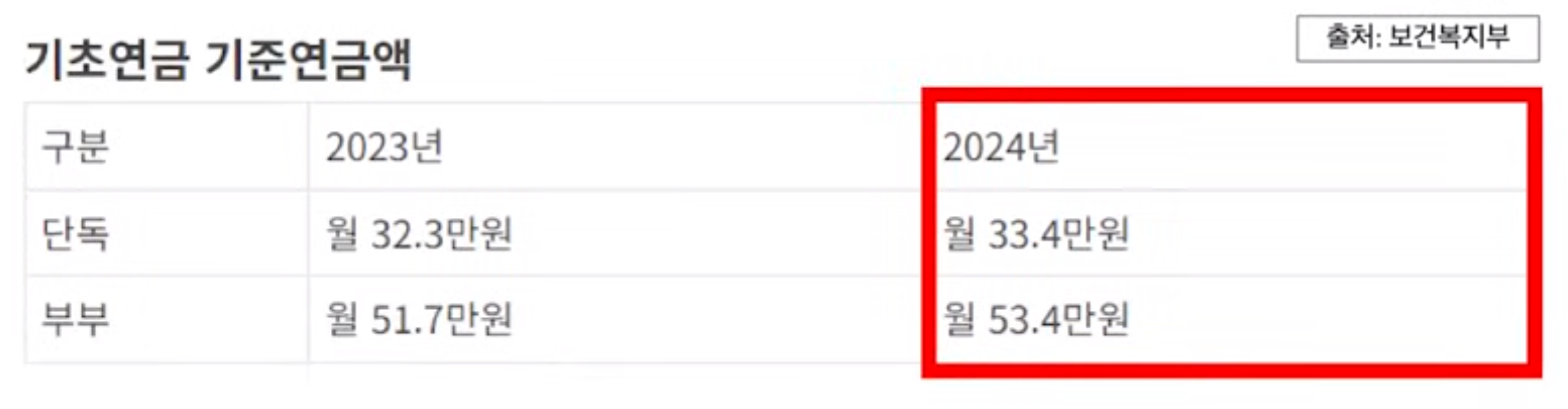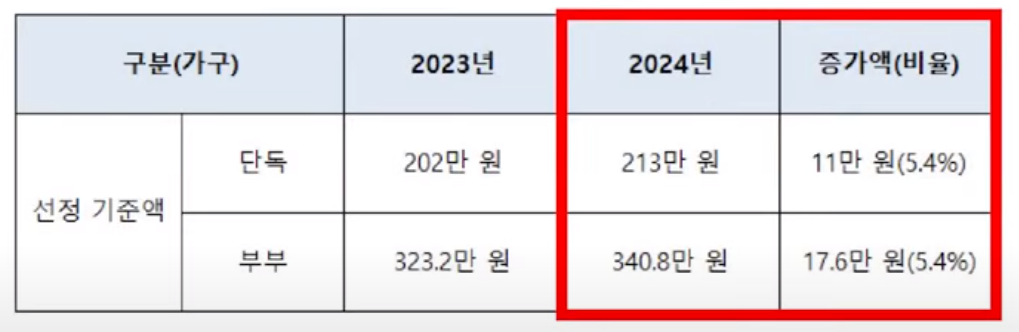 2023년 기초연금 선정 기준액은 단독 가구 기준 월 202만원 이었습니다. 이 금액이 2024년에 월 213만원으로 11만원, 5.2% 인상되었습니다. 부부가구는 323만 2천원에서 340만 8천원으로 17만 6천원, 5.2% 인상되었습니다.
