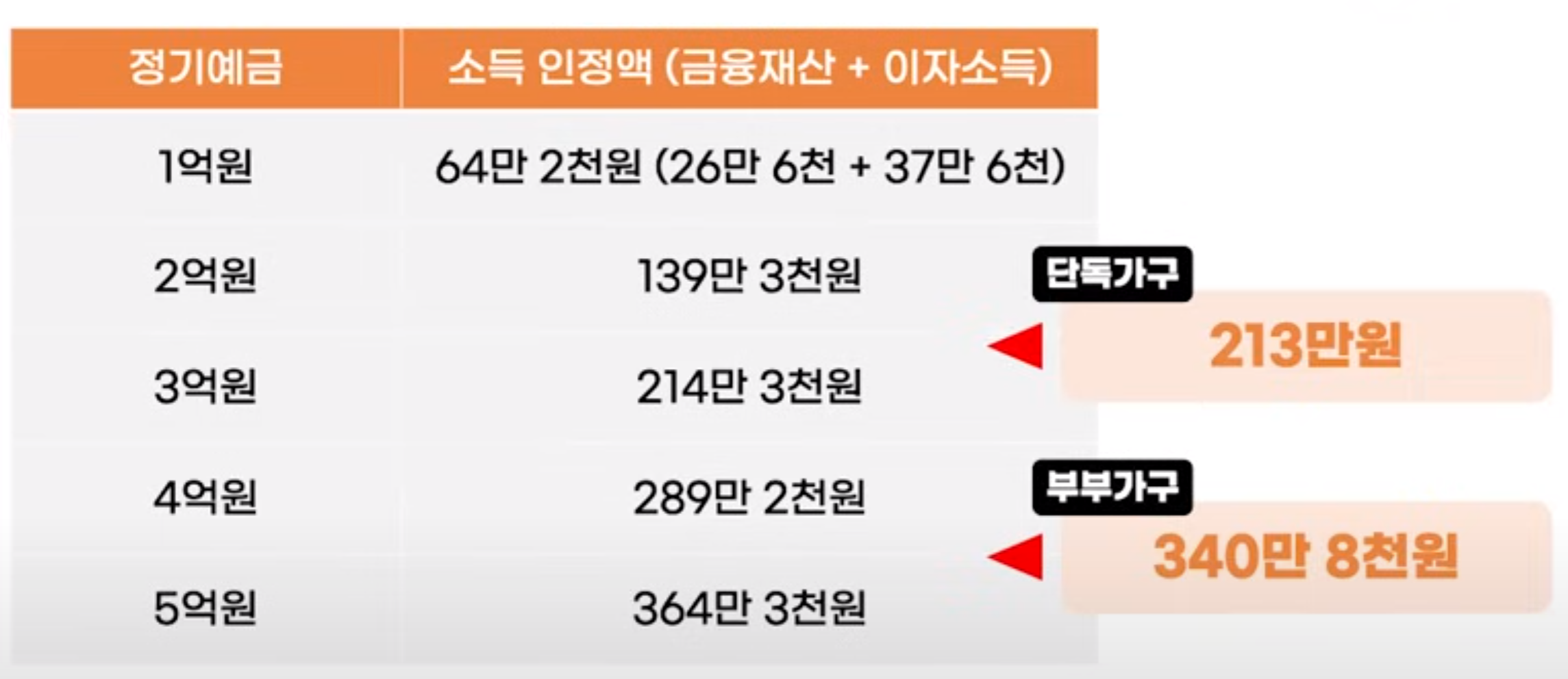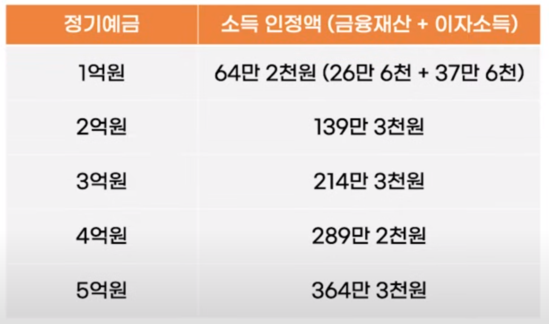 그러므로 둘을 더해 주면 1억원에 대한 소득인정액은 64만 2천원이 됩니다. 같은 방식으로 2억원에 대한 소득인정액은 139만 3천원, 3억원은 214만 3,천원, 4억원은 289만 2천원, 5억원은 364만 3천원이 됩니다.
