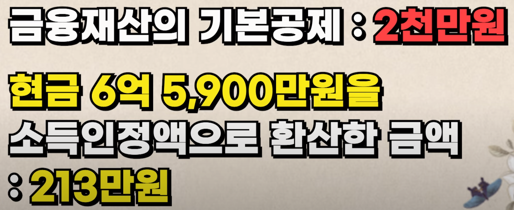 금융재산은 기본공제가 2천만원인데요. 현금 6억 5,900만원을 소득인정액으로 환산한 금액이 213만원, 현금 10억 4,240만원을 소득인정액으로 환산한 금액이 340만 8,000원이기 때문에