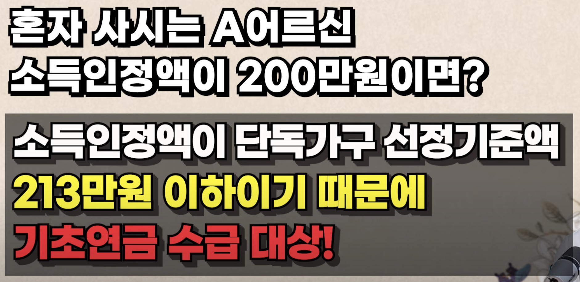 예를 들어 혼자 사시는 A 어르신의 소득인정액이 200만원이라고 하면 소득인정액이 단독가구 선정기준액 213만원 이하이기 때문에 기초연금 수급 대상이 맞습니다.
