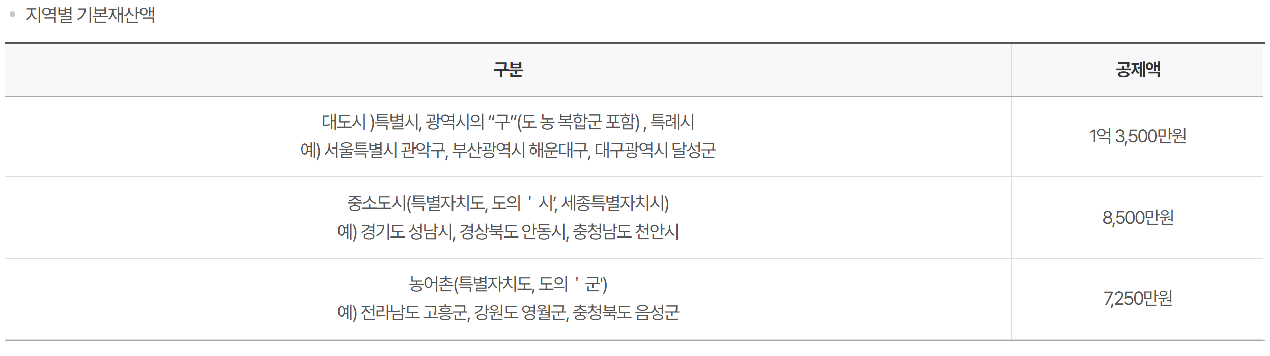 | 중소도시 | 7억 2,400만원 이하 | 6억 2,350만원 이하 |