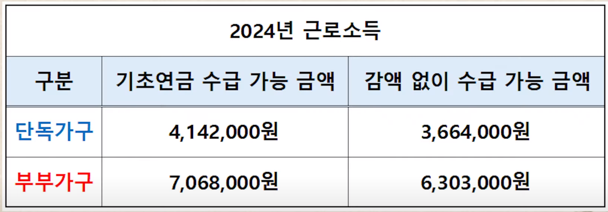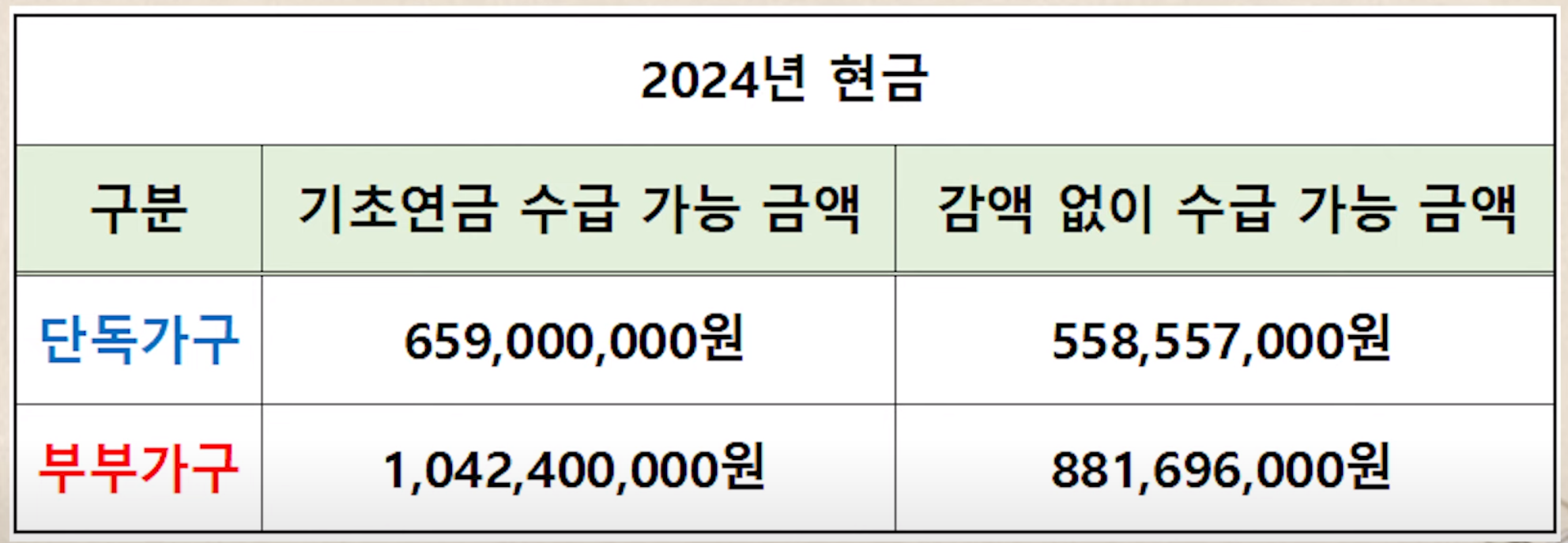 | 기초연금 수급 가능 금액 | 기초연금 감액되지 않고 수급 가능 금액 |