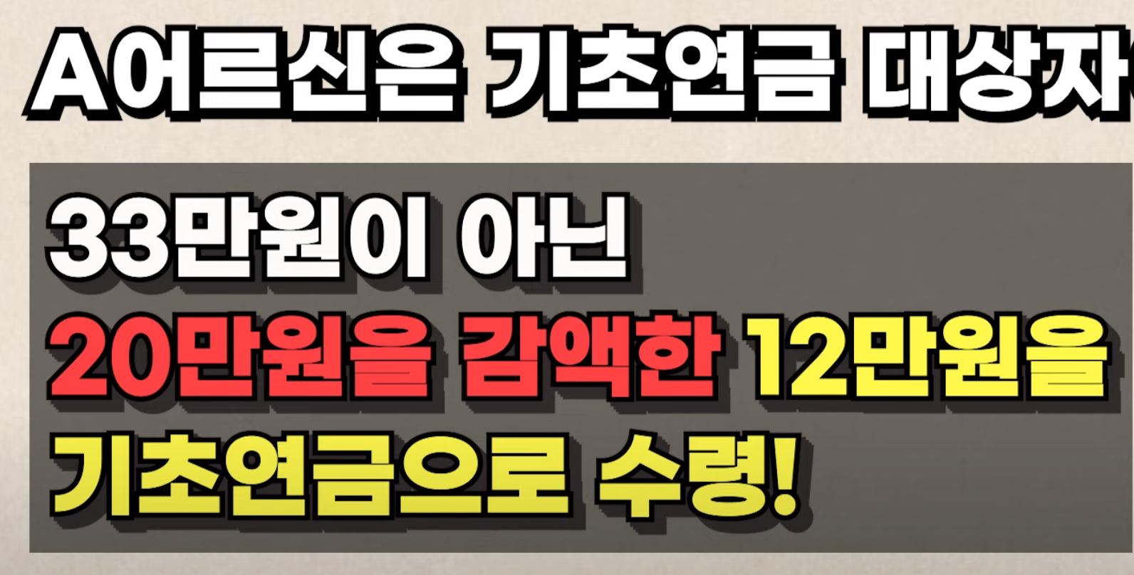 따라서 A 어르신은 기초연금 대상자이지만 33만원이 아닌 20만원을 감액한 12만원을 기초연금으로 받게 되는 것입니다.