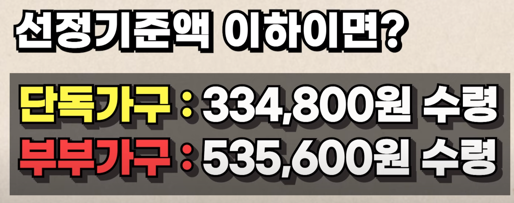 소득으로 환산한 소득환산액이 선정기준액 이하이면 단독가구는 최대 33만 사천원, 부부가구는 53만 오천원을 받을 수 있습니다.