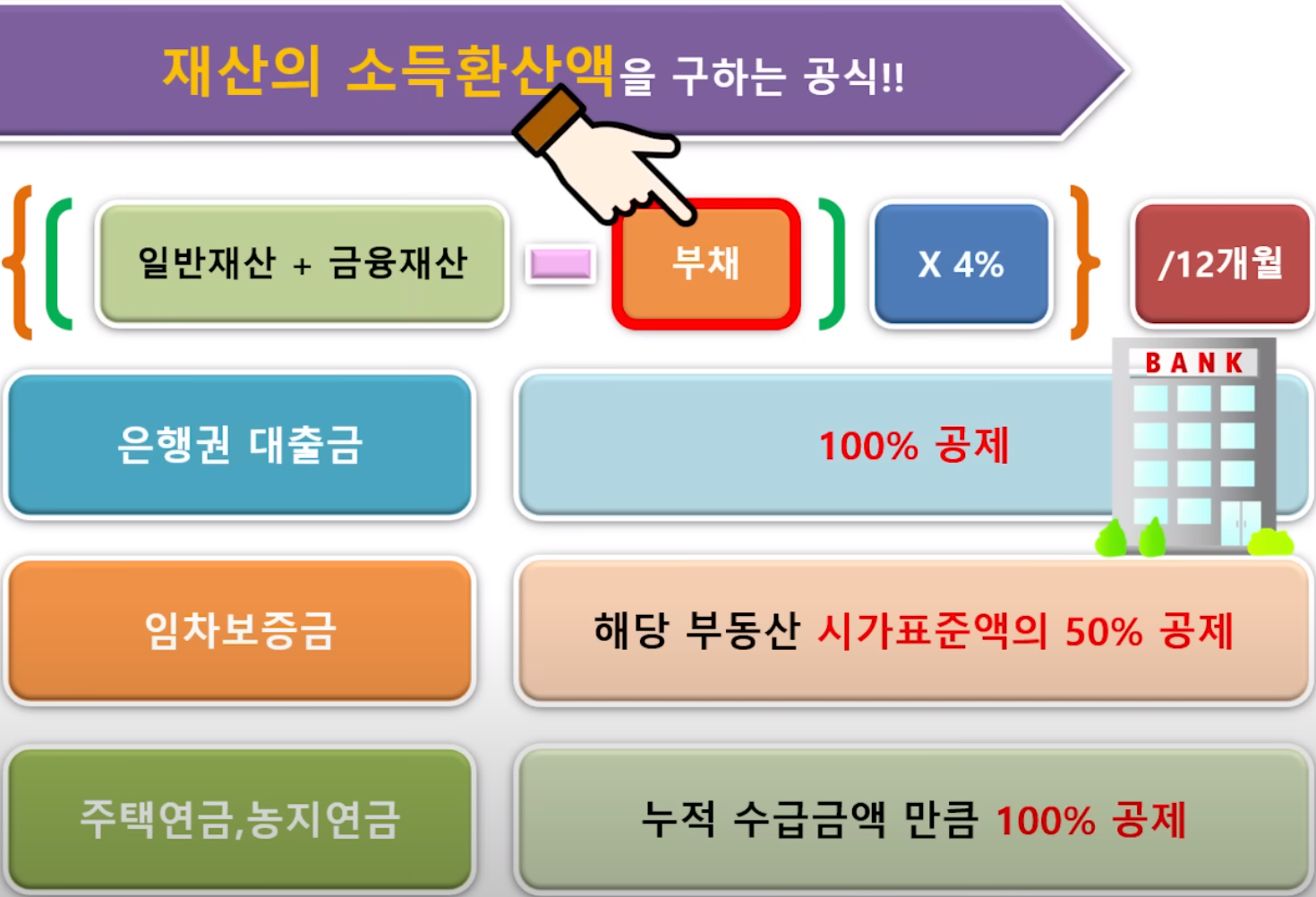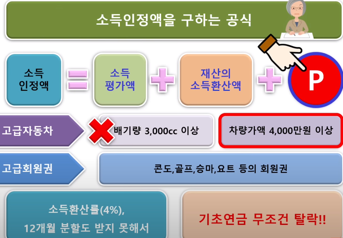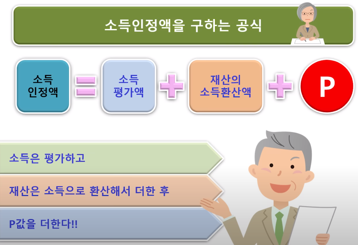 소득을 평가하고 보유하신 재산을 소득으로 환산해서 더한 후 마지막으로 P 값을 더해 준다는 얘긴데요.