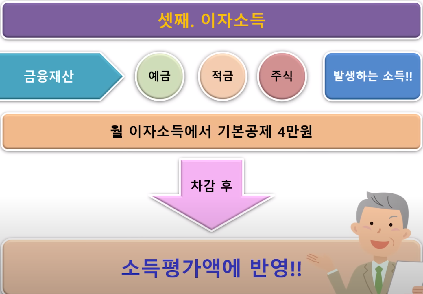 셋째 이자소득입니다. 이자소득은 금융재산 즉, 예금, 적금, 주식 등에서 발생하는 소득을 의미합니다.