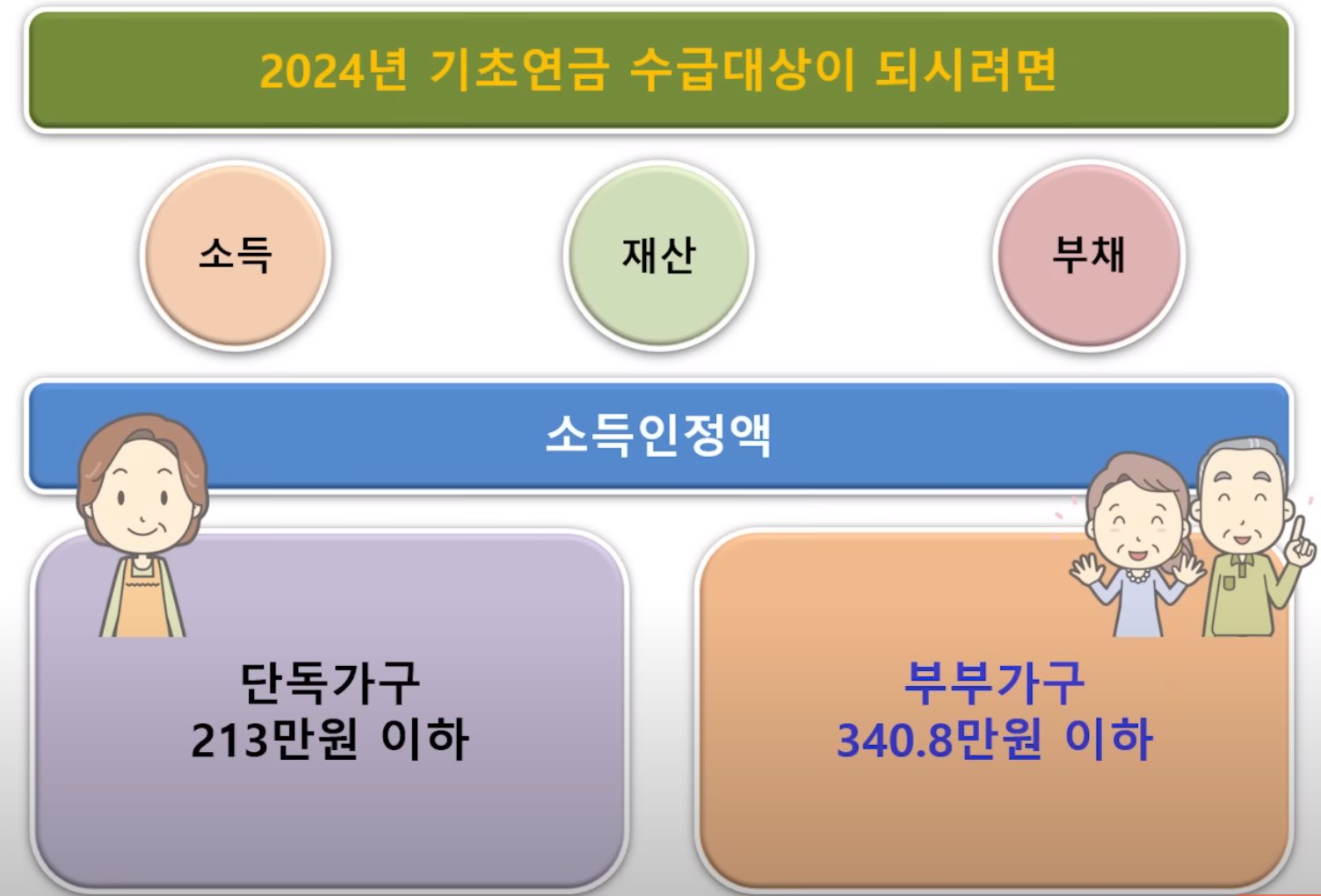 2024년 기초연금 수급 대상이 되시려면 신청인의 소득과 재산 그리고 부채까지 모두 반영한 소득인정액이 단독가구 213만원, 부부가구 340만 8,000원 이하여야 합니다.
