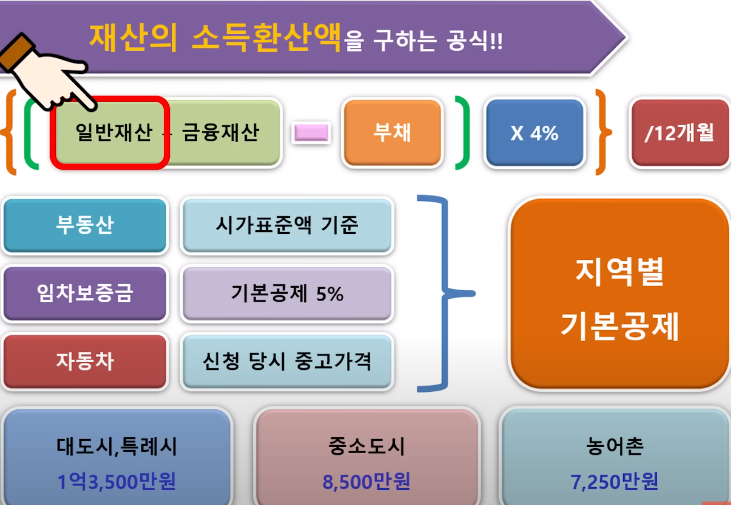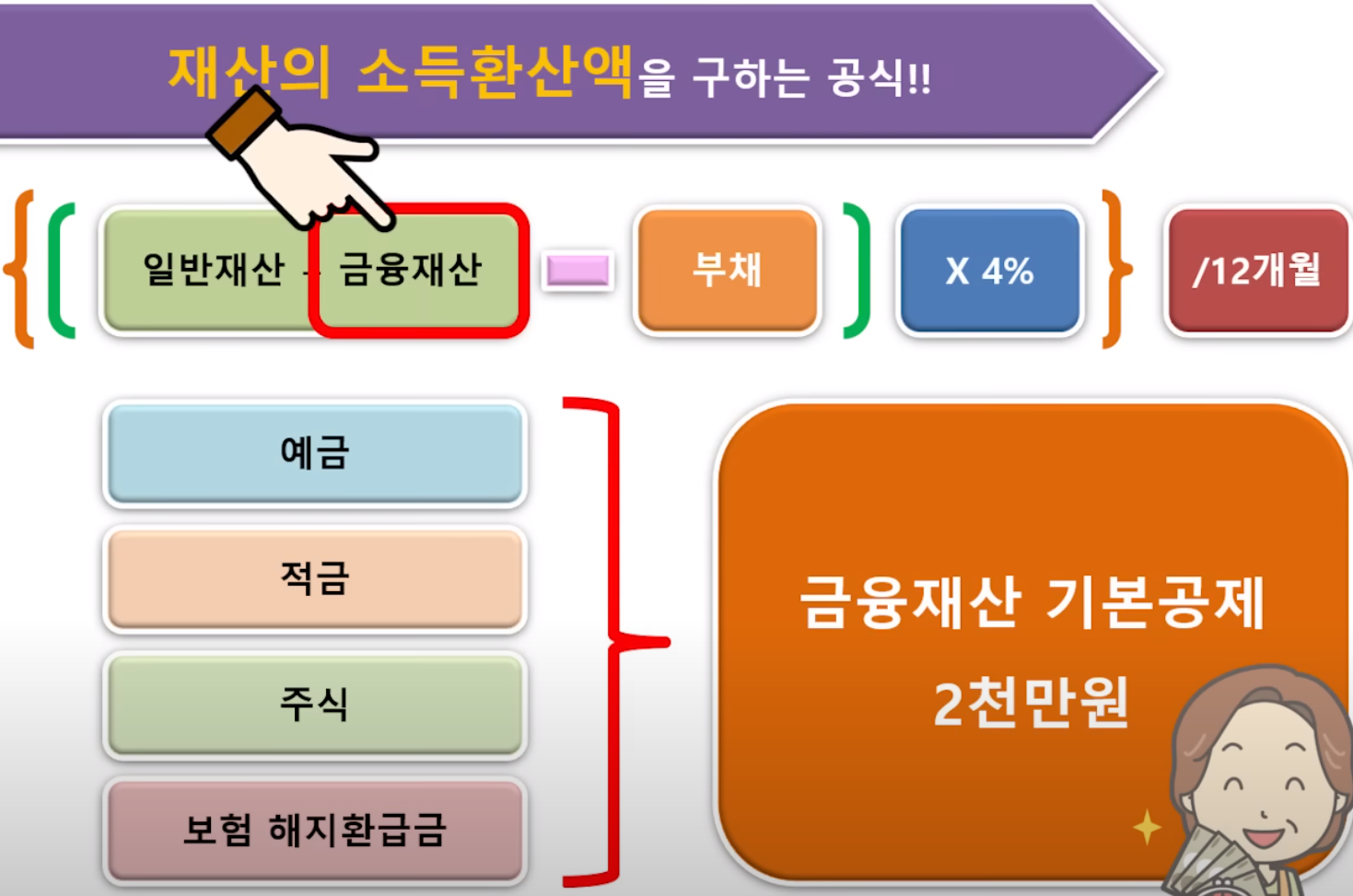 재산의 소득환산액을 구하는 공식은 일반재산과 금융재산을 더한 후 부채를 빼주고 여기에 소득환산율 4%를 곱해 주고 이것을 다시 12개월로 나눠 주면 됩니다.