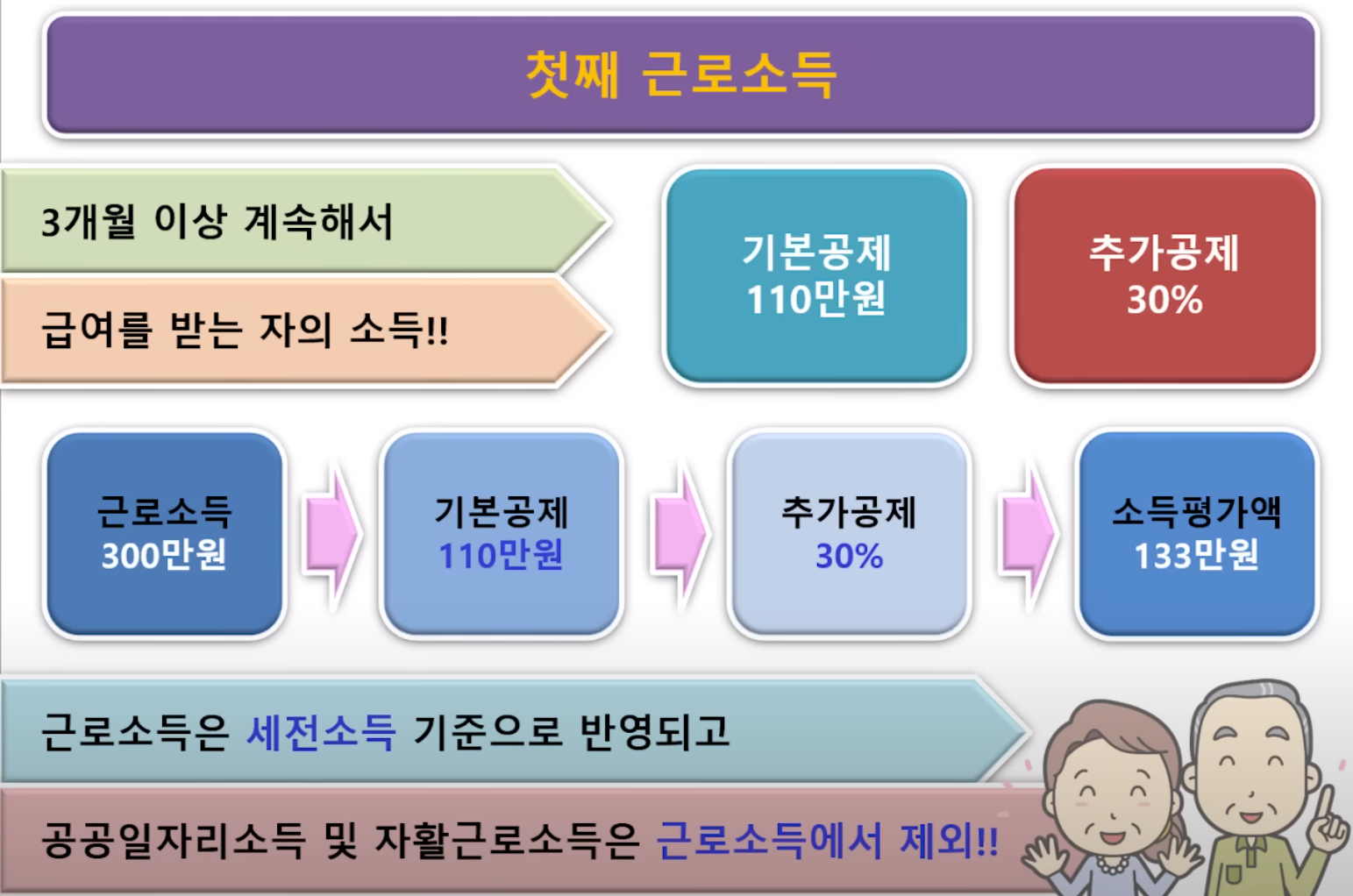 예를 들어 근로소득이 300만원일 경우 기본공제 110만원에 추가공제 30%를 적용하면 133만원이 소득평가에 반영됩니다.