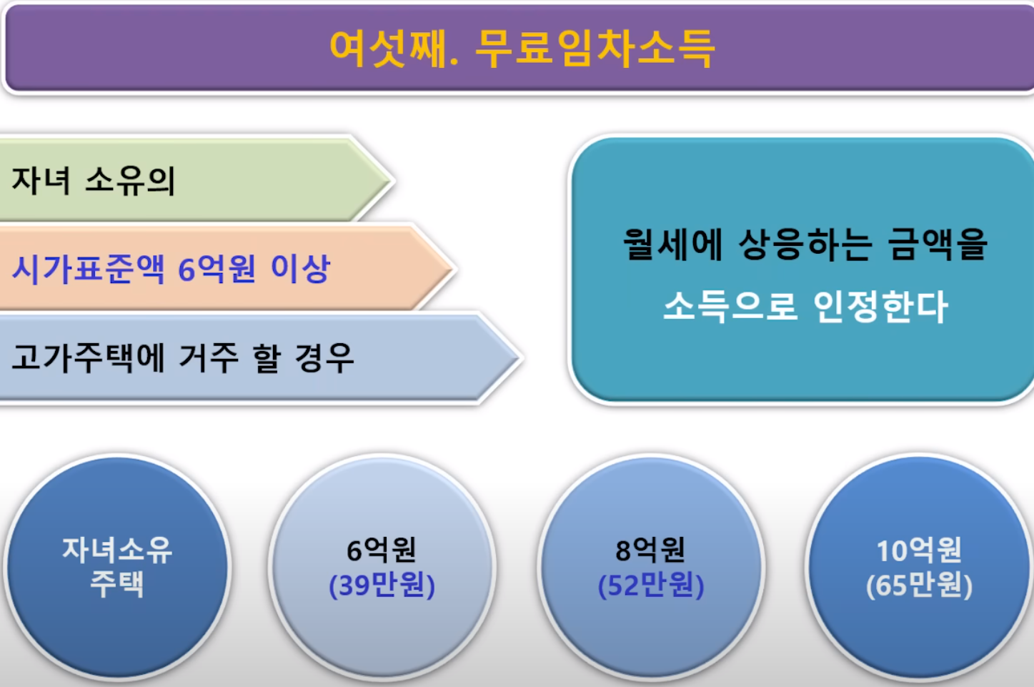 마지막으로 무료임차소득입니다. 무료임차소득은 자녀 소유의 시가표준액 6억원 이상 고가주택에 거주할 경우 월세에 상응하는 금액을 소득으로 인정하는 것을 의미합니다.