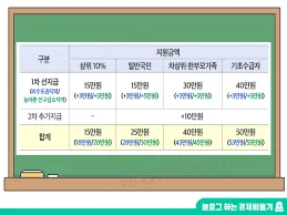- 금액: 기본적으로 1인당 25만원이 지급됩니다. 단, 소득 하위 90% 가구에는 10만원이 추가 지급되어 총 35만원을 받을 수 있어요. 추가 지급분은 2차 신청 기간에 별도로 신청합니다.