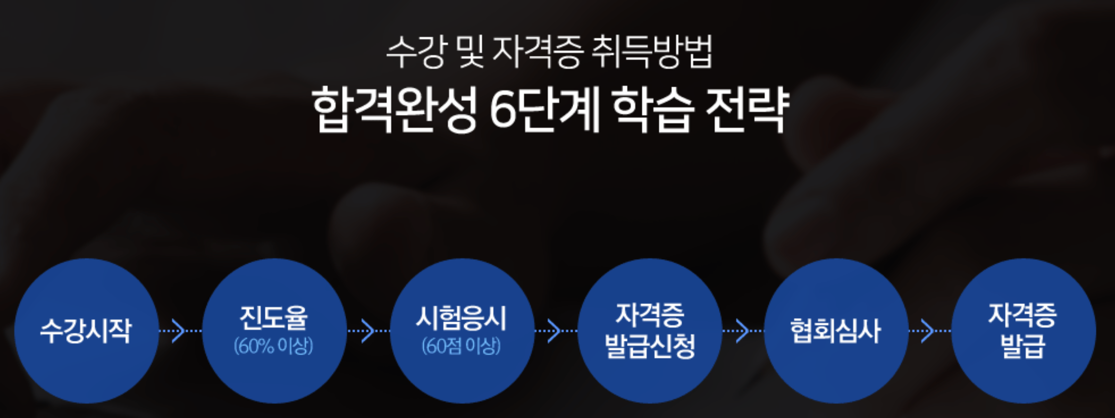위 교육 과정을 수강하신다면 자격증 시험에 응시할 수 있는데요. 교육 진도율 60% 이상이신 분들이 시험에 응시할 수 있습니다.