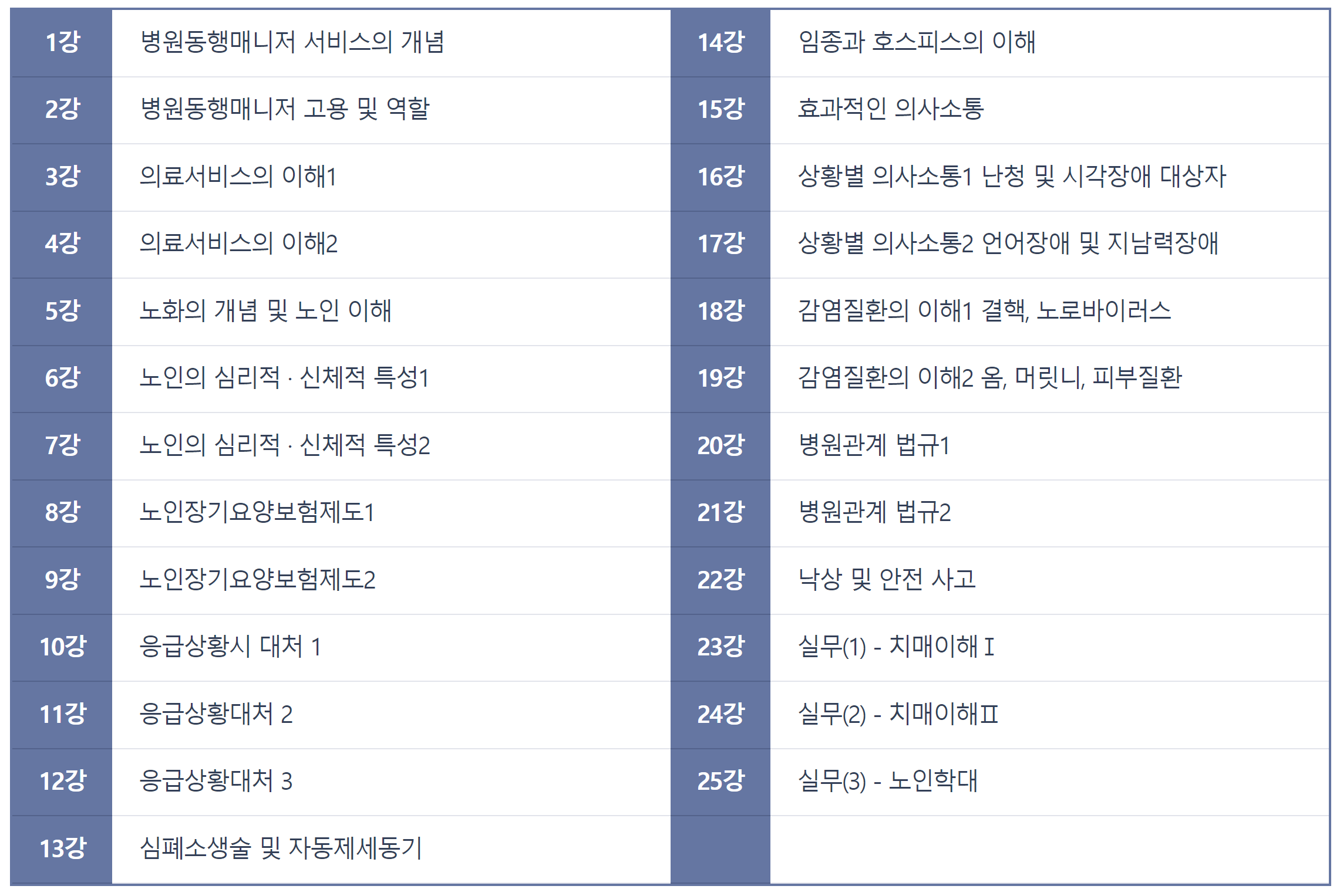 이 외에도 전문적인 의료 서비스에 대한 내용과 노인들에 대한 내용, 그리고 응급상황에 대처하는 방법, 병원 관계법규까지 교육받으실 수 있습니다.