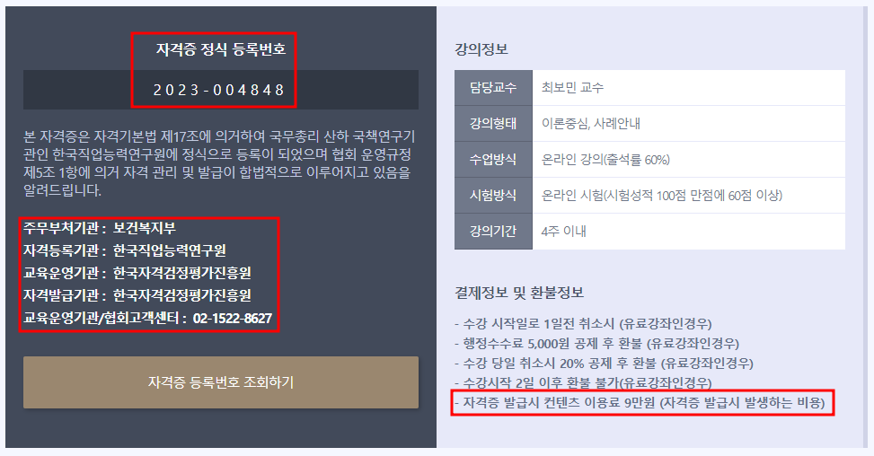 참고로 교육은 무료지만 합격 후 자격증 발급시 컨텐츠 이용료 9만 원(자격증 발급 시 발생하는 비용)을 납부하셔야 합니다.
