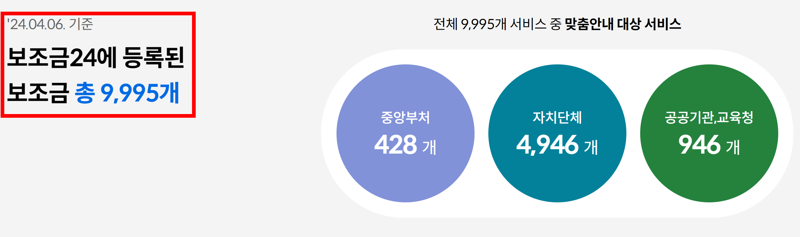 보조금24를 통해 안내 받으실 수 있는 보조금은 2024년 4월 6일 기준 총 9,995개이고, 현금, 현물, 이용권 등 5,800여 개의 서비스에 대해 개인의 연령, 소득, 자격기준 정보를 행정기관에서 보유하고 있는 정보와 연계하여 맞춤 안내 서비스를 제공하고 있습니다.