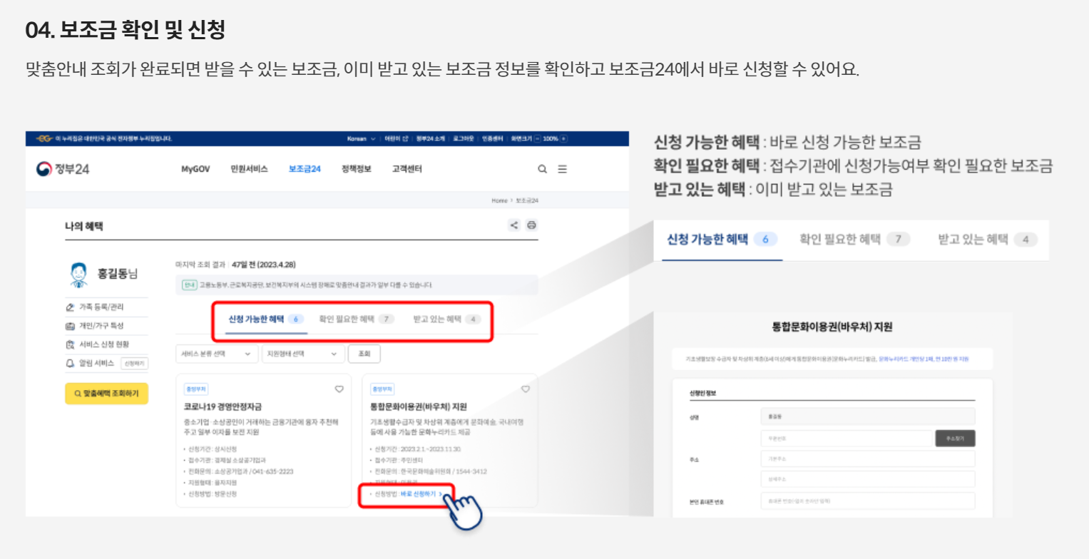 또한 보조금24는 여러 서비스별 대상자 자격조건을 시스템간 정보연계를 통해 확인 가능한 정보로 혜택받을 수 있는지를 안내하고 있으며,