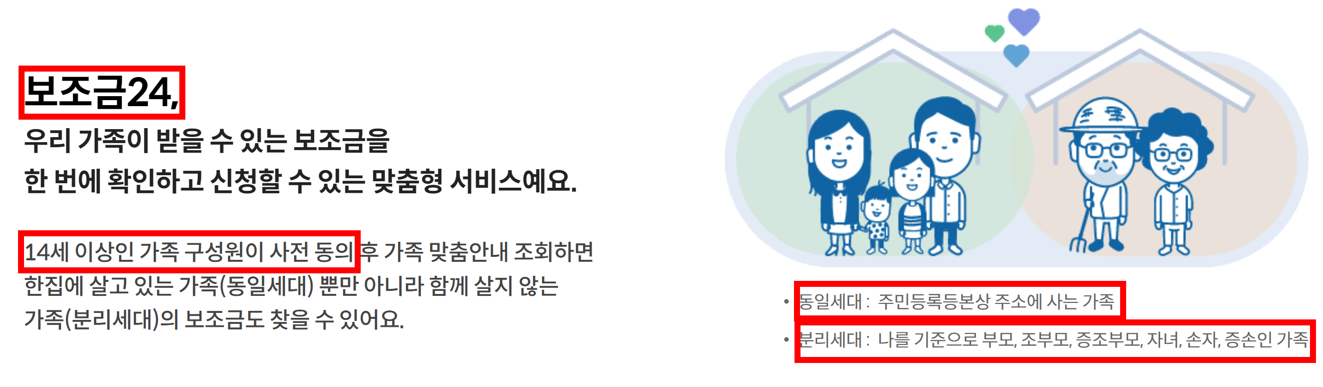 보조금 24 서비스 대상은 본인은 물론 14세 이상 가족이 사전에 동의하면 함께 사는 가족(동일세대) 뿐만 아니라 함께 살지 않는 가족(분리세대)의 정부 혜택도 확인 가능 합니다.