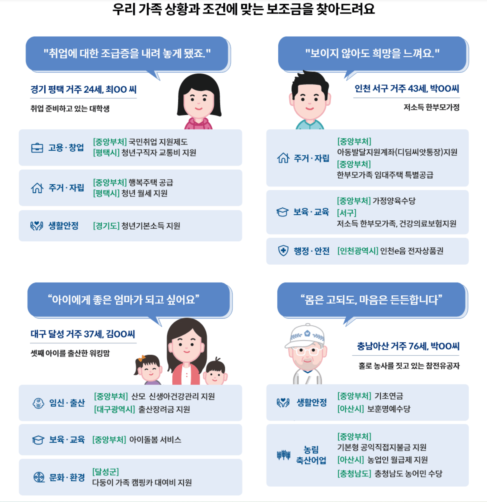주된 서비스 내용은 가족의 상황과 조건에 맞는 보조금을 특별한 과정없이 바로 찾아 신청(일부서비스) 할 수 있다는 것입니다.