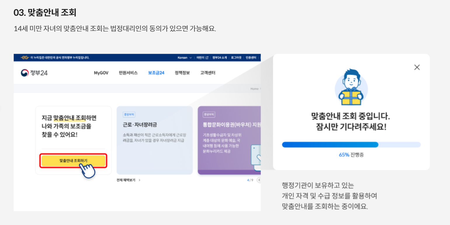 서비스별 연령·소득·가구 특성 및 자격정보를 매칭하여 서비스 대상자 조건이 모두 일치하는 경우에는 '신청하세요'로, 일부 조건만 확인되는 경우에는 '확인하세요'로 안내하고 있다고 합니다.