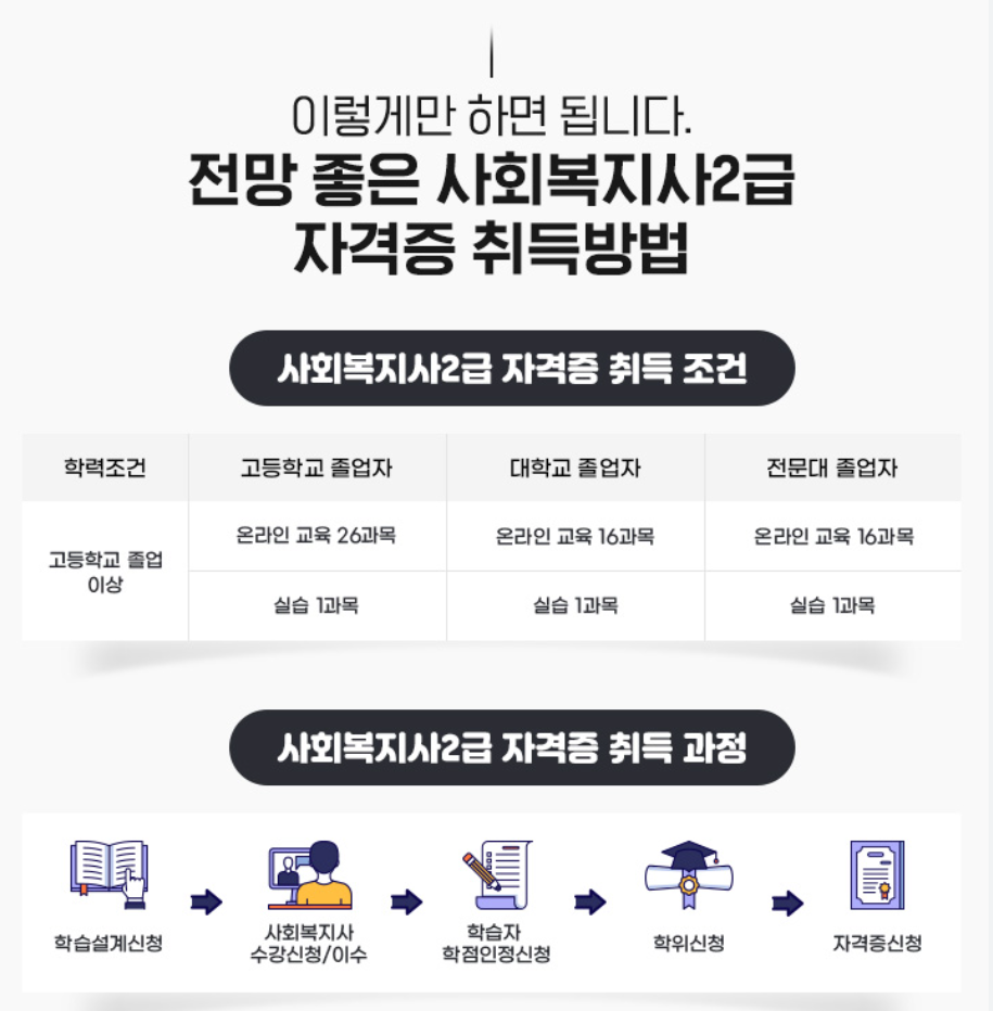 사회복지사 2급 자격증을 취득하기 위해서는 전문대 이상 졸업 학력과 관련 과목을 이수해야 합니다.