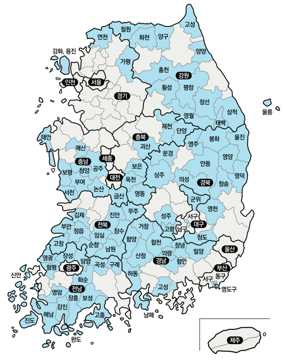 - 선정 기준: 연평균인구증감률, 청년순이동률, 고령화 비율, 재정자립도 등 8가지 복합 지표 활용.