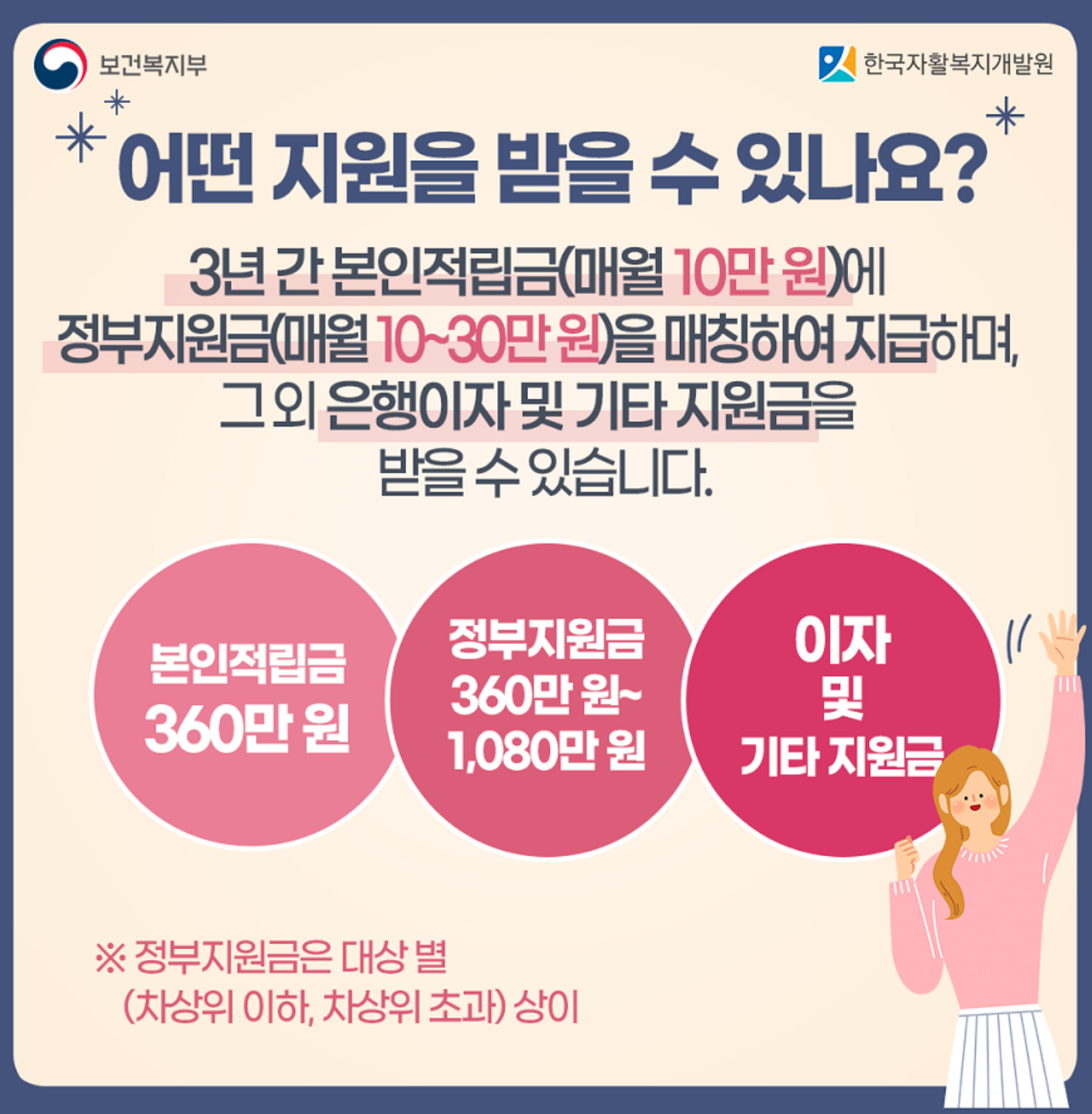 - 매월 본인저축액 10만원 이상 저축 + 3년간 근로활동 지속 + 교육이수 + 자금사용계획서 = 근로소득장려 금 360만원 지원(매월 10만원 적립)